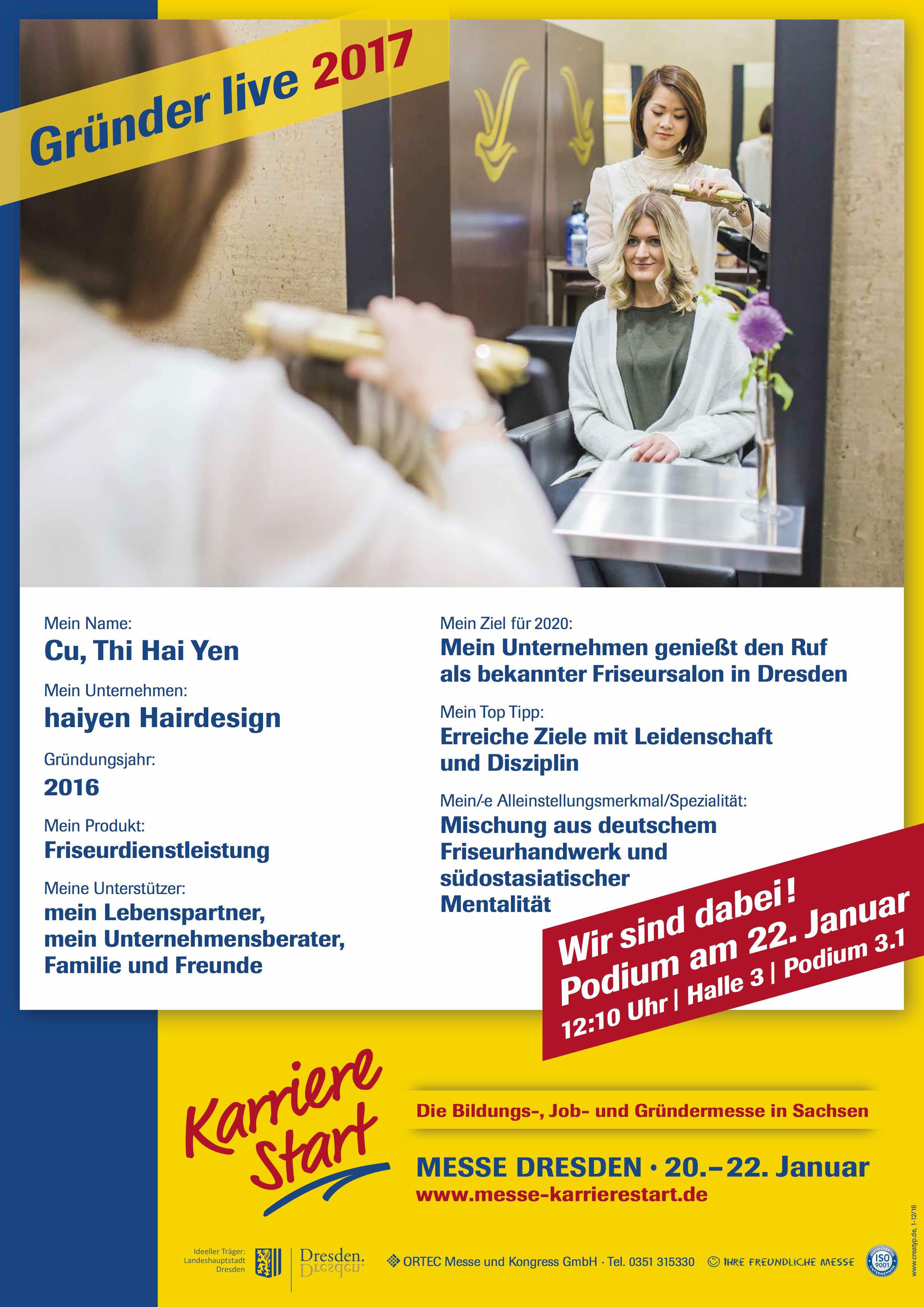 haiyen Hairdesign war auf der Messe KarriereStart 2017 in Dresden vertreten. Hier berichtete Yen über ihren Weg zur Selbstständigkeit und gab Ratschläge an potentielle Gründer.